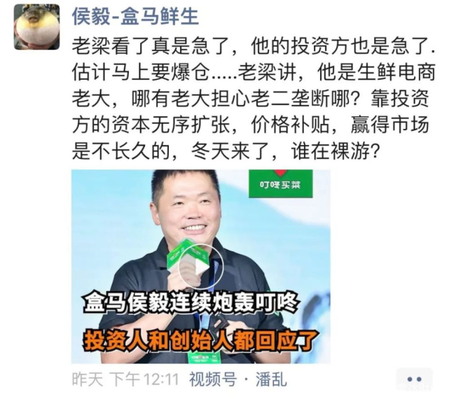 3月14日,盒馬CEO侯毅在朋友圈向叮咚買菜開炮,稱叮咚買菜“估計馬上要爆倉……靠投資方的資本無序擴張,價格補貼,贏得市場是不長久的。”同時還配了一個“盒馬侯毅連續炮轟叮咚,投資人和創始人都回應了”的視頻。