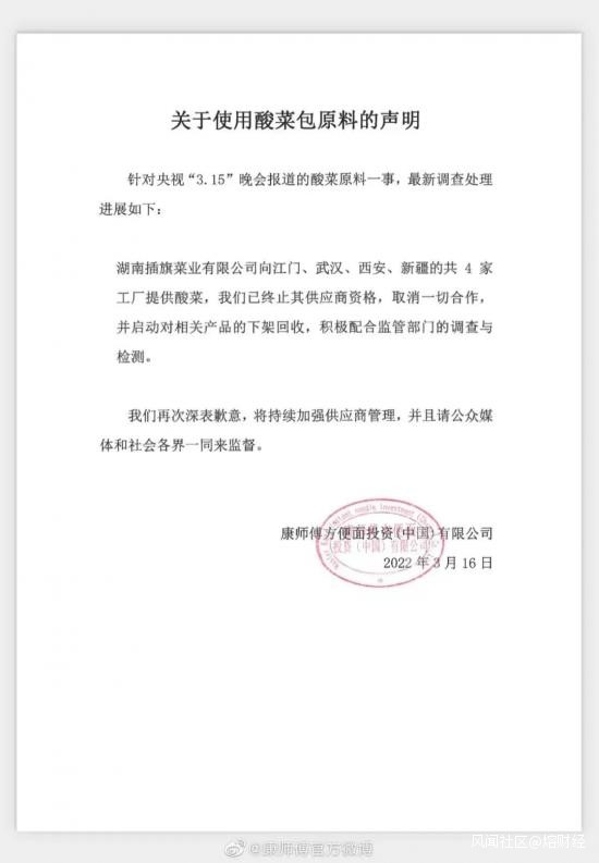 城門失火殃及池魚,相對來説,另一位被波及的品牌康師傅雖然性子略微慢,截至目前共發了兩份聲明,但“面對的態度更好,姿勢也更正確”:承認涉事企業為其四個工廠的供應商,即刻停止合作,也就地封存相關酸菜包,下架老壇酸菜牛肉麪。康師傅,你以後挑選供應商可長點心吶。