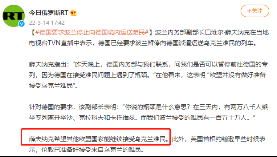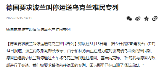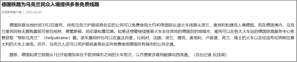 德國交通部門也大咧咧宣佈,所有持有烏克蘭護照或身份證的難民,可免費乘坐從波蘭前往德國的火車前往德國,並且還會和波蘭方面商討加開班次,讓更多難民疏散前往德國。