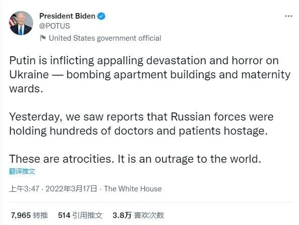 拜登在推特上發聲,説普京“通過轟炸公寓大樓和婦幼醫院,將駭人聽聞的破壞和恐怖加諸在烏克蘭人身上”,這些都是“暴行”。