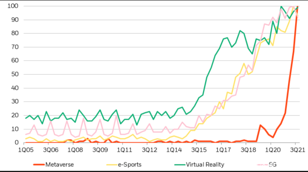 公司成績單中提及“元宇宙”的勢頭與其他主題(來源:摩根士丹利,2021 年 11 月)