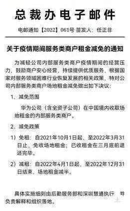 3月14日,華為任正非簽發郵件宣佈:全國華為在中國境內的場地、園區的餐飲商户,將享受華為免租6個月,9個月減租50%的優惠扶持,合計減免租金15個月!除了減免租金,就連已收上來的租金,華為也將退還。3月31日前,華為將退回6個月租金。