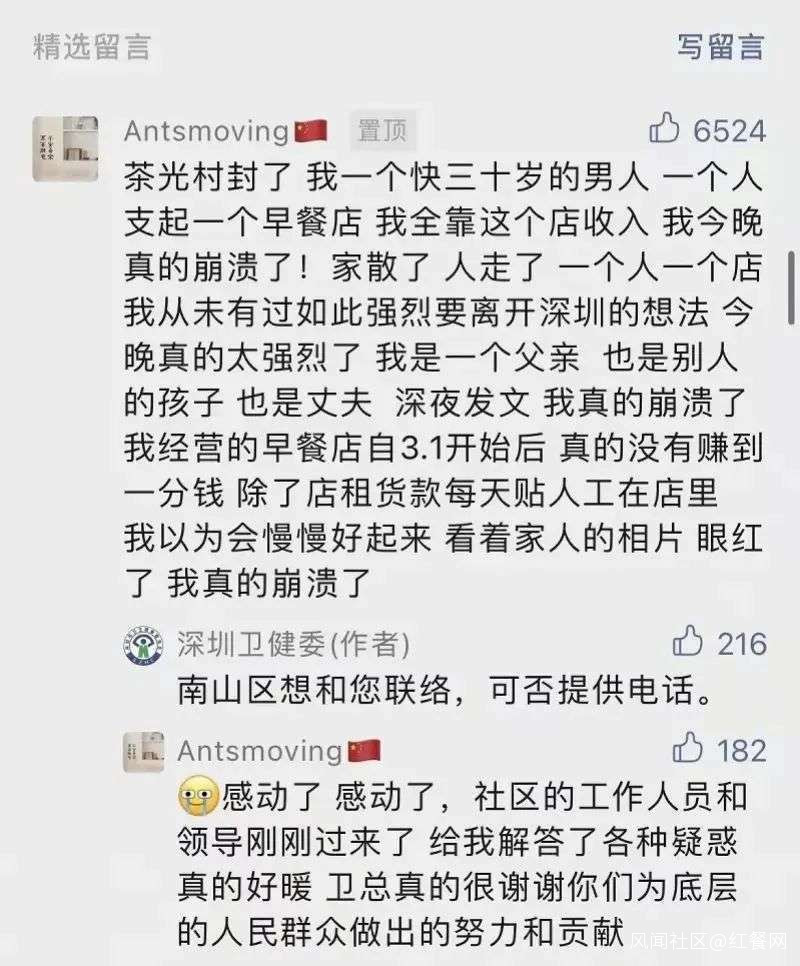 昨日,深圳衞健委公眾號下的一則留言受到網友關注。深圳市民賴先生稱其從3月1日以來,經營的早餐店沒有賺到一分錢,聽到茶光村封了的消息,崩潰了。