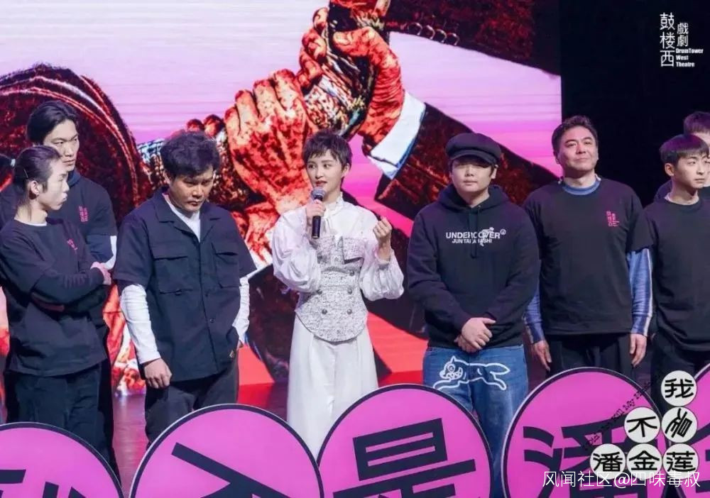 這就是為什麼到今天我最後會跟金蓮説,我不要有來世了,我也不要做女人了,我就希望這個世界上不要有任何一個女人被叫做潘金蓮,這個是我們最終要表達的東西,它是很大的,也是非常有女性觀點和視角的,還有我們的姿態的。所以我先生就覺得一滕很了不起,一個這麼年輕的導演然後這樣的一個判斷和格局,他能站在女性的視角去講述一個像《我不是潘金蓮》的原著小説這麼一個荒誕有趣的故事,最後他能把立意從裏面拔起來。李雪蓮這個人物也是這樣的,最初我提的意見無非就是説如果不把這個農村婦女給她挖出來,不給她鑿實了,那她後面做的一切事情等於説又重蹈覆轍,大傢伙電影也看了,小説也看了,我們為什麼要做這個戲劇,為什麼要跟電影和小説要不一樣呢,我們把這個力量用在什麼地方?後來我們因為製作人和編劇也是女性,一滕也非常的尊重女性,他也很想成為女性,大家就一拍即合,從前期的文本到我們中間排練,到後期包括潘金蓮這個人物的進入,非常的美妙和神奇。我就對一滕有一個直觀的判斷,就是他非常優秀,太有才華了,他對中國的藝術運用的非常的對,不像他這個年紀的孩子。