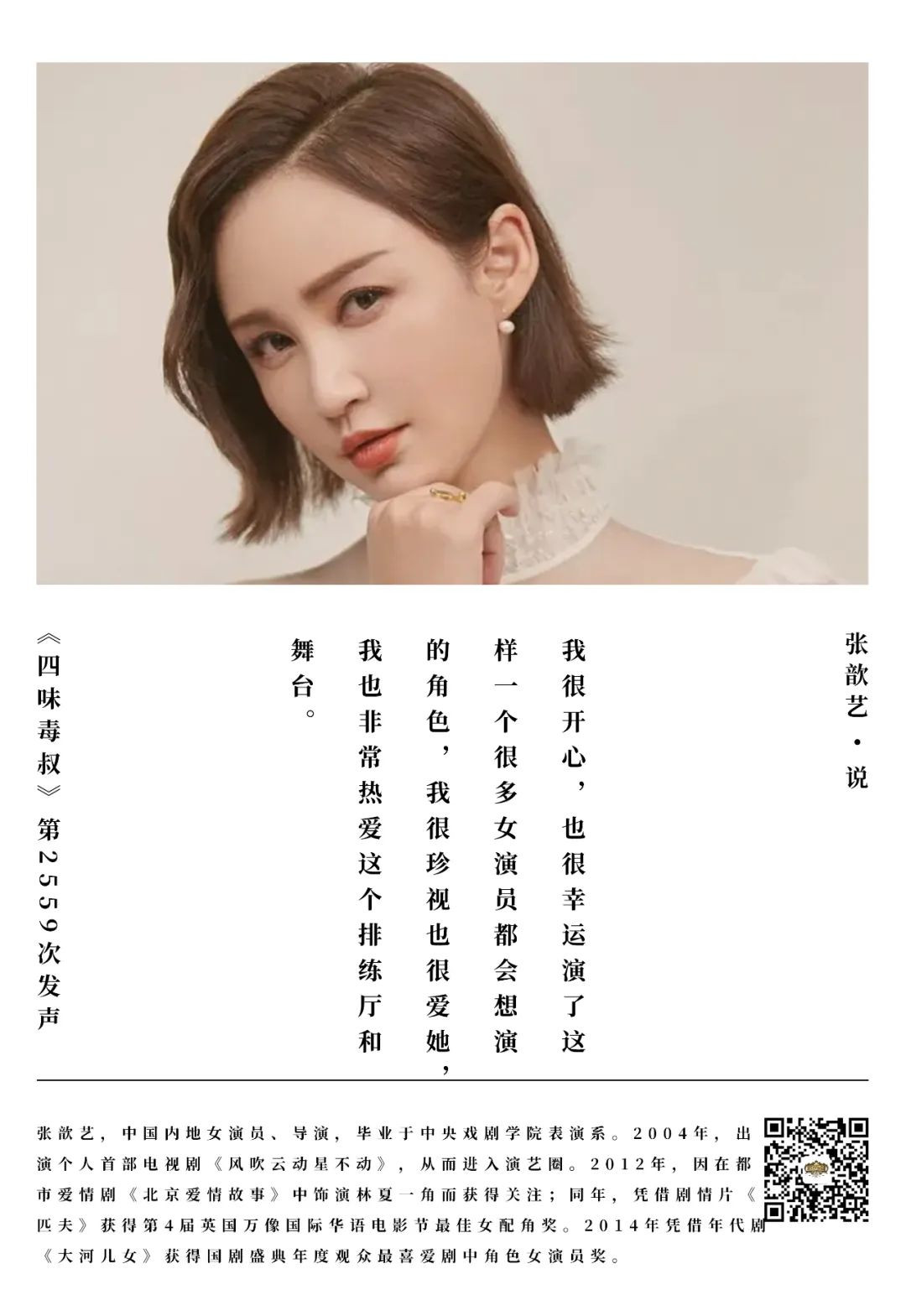 **張歆藝:**我就是想説我很開心,也很幸運演了這樣一個角色,我感覺很多女演員都會想演,但是她落到我的頭上了,所以我很珍視她,我很愛她,我也非常的熱愛這個排練廳,熱愛這個舞台,太神聖了,《我不是潘金蓮》確實是一台非常優秀的戲劇,這個時代還是需要戲劇的,需要表達,需要藝術。