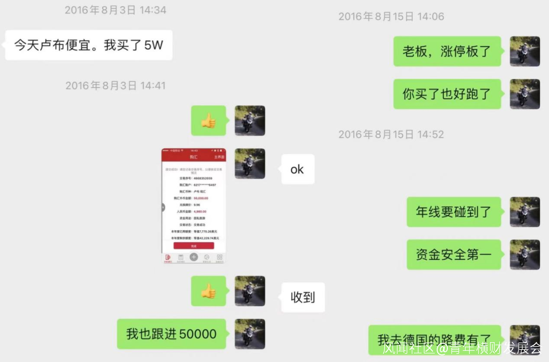 第一次回來之後,老郭跟着朋友買了5萬盧布外匯,一直在觀察匯率走向,8月3日買,8月15日賣,他賺了一張飛去德國的機票。
