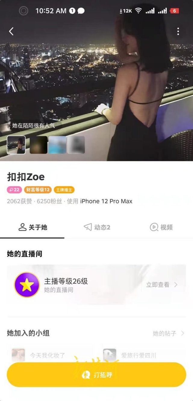 那是陌陌平台的一位人氣女主播,網名叫“扣扣ZOE”,憑藉清純的外表和動人的歌聲,入駐平台一年多時間收穫6000多名粉絲,主播等級達到26級。