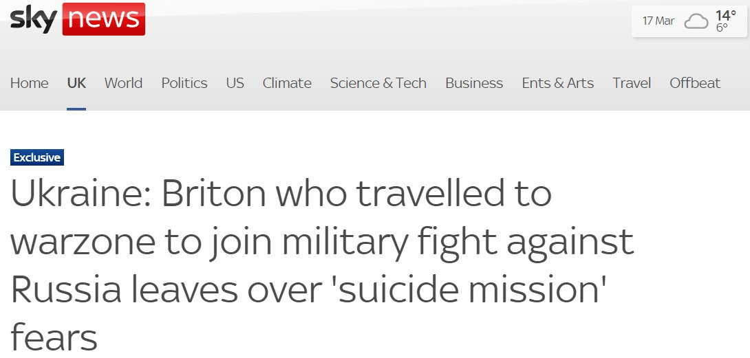《天空新聞》:一名前往烏克蘭參加軍事打擊俄羅斯入侵的英國男子説,他因擔心自己面臨“自殺任務”而離開了戰區。