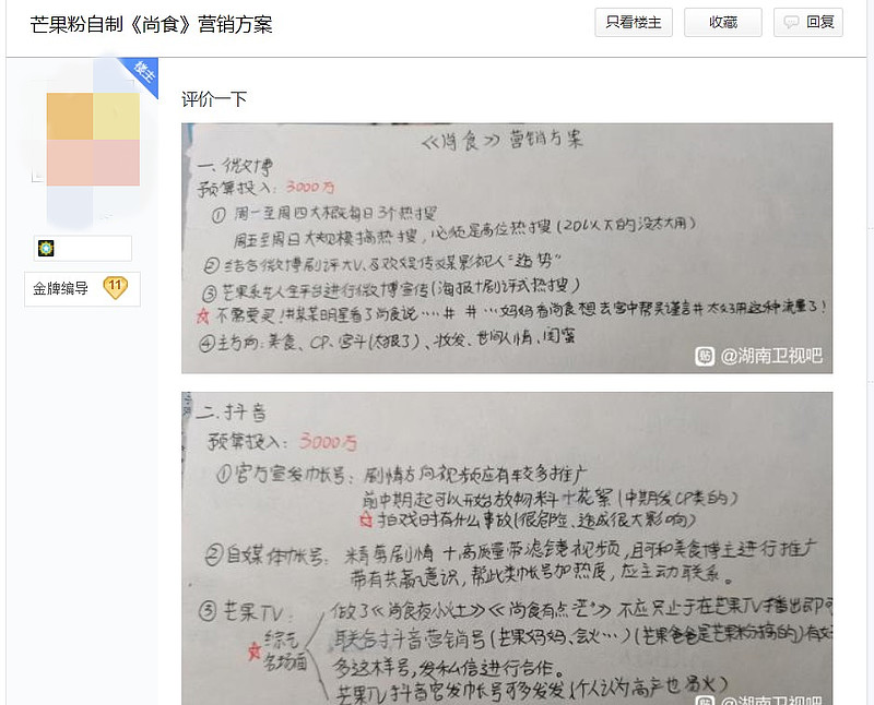 開播四天後,“芒果粉自制《尚食》營銷方案”也在貼吧發佈。一位吧友分微博、抖音、公眾號等多渠道提供了想法,想了十餘個熱搜詞,甚至連預算範圍都貼心的標記了出來。一位從業者對毒眸表示,自家劇在湖南衞視或芒果TV上的時候,確實都會去貼吧關注一下芒果粉出的主意。