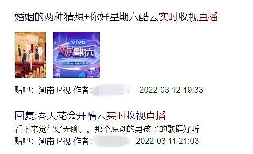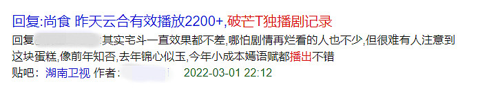 如果節目和劇在芒果TV網播,事情還會變多:雲合數據、德塔文、Vlinkage、燈塔、貓眼等一系列能看到網播數據的平台也要觀測起來。芒果TV獨播劇《尚食》是吧內近期熱點,捷訊頻傳——“V榜和德塔文都是第一”“雲合脱水數據2200萬,破芒T獨播劇記錄了”,還有人感慨“如果上星就好了”。