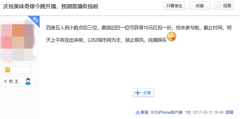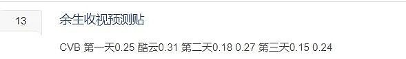 猜收視率數據仍然是貼吧常見的活動之一。《餘生請多指教》開播前,芒果粉就已經在猜前三天的酷雲數據及第一週的CVB數據。不少猜測貼下,數字最接近的人還能獲得樓主的獎勵。過去,一部熱播劇收視即將邁過1%和2%的門檻時,小吧主們也會出來開直播貼,稱“破了就送紅包”。