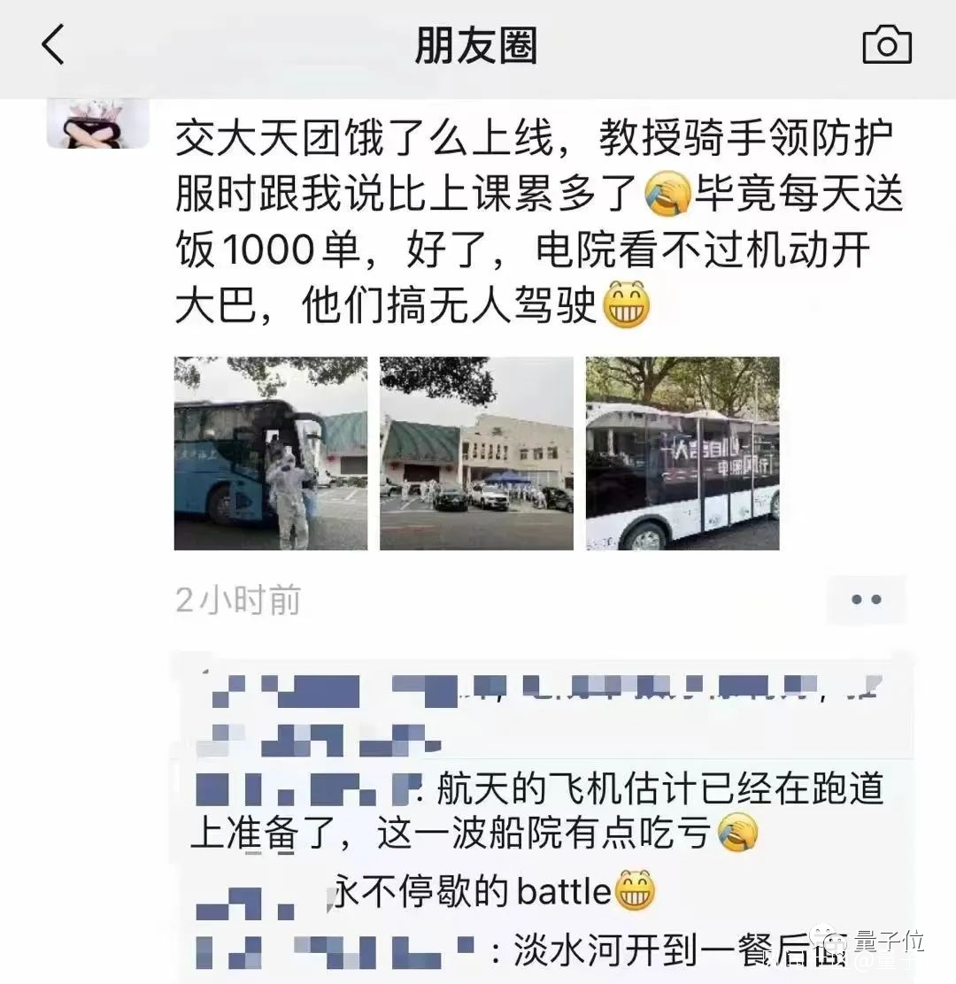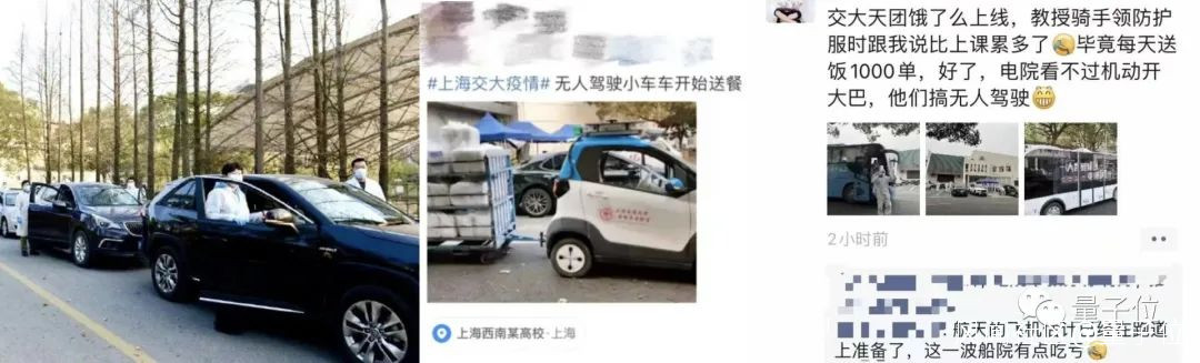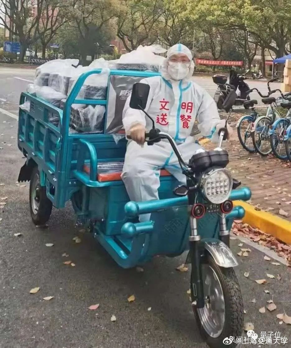 於是從第二天開始,老師們就把更新迭代了配送工具。不僅加上了可以在校園裏穿梭自如的三蹦子,還把自動化系自研的無人車也開了出來!