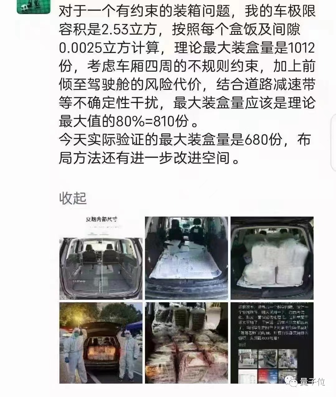 經過嚴密測量,這位老師算出來了自己的車極限容積是2.53立方,每個餐盒及間隙的大小約為0.0025立方。