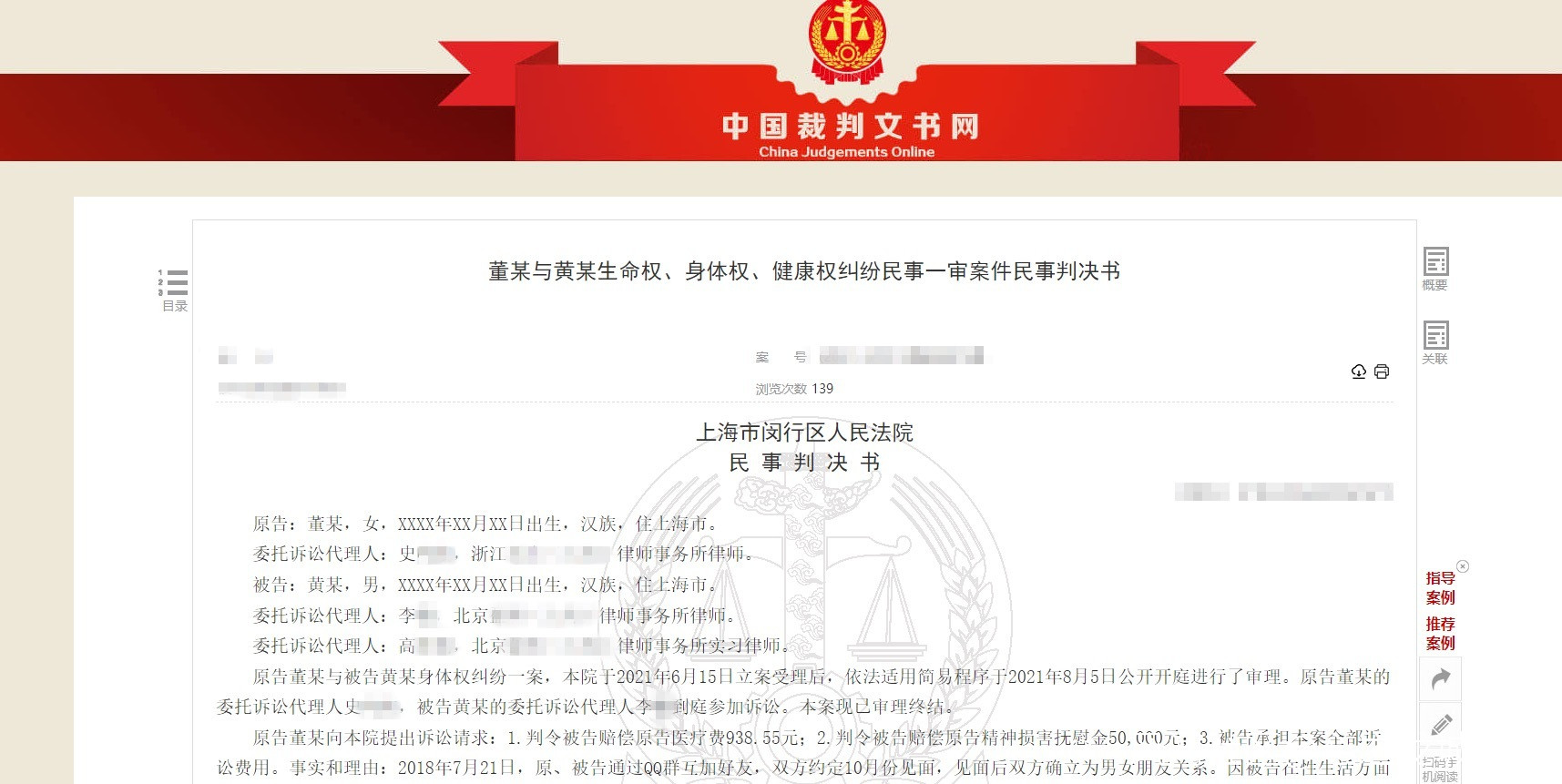 日前,上海的董女士將前男友黃先生起訴至法院,索賠醫藥費938元以及5萬元的精神撫慰金。