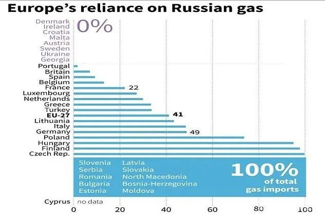 歐洲各國對俄天然氣的依賴度,烏克蘭為零
