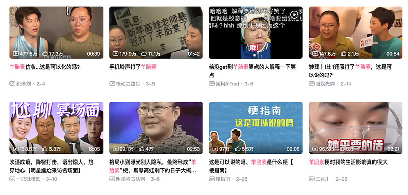 在B站,最初視頻仍以各種真人仿妝為主,其後不同分區up主紛紛下場。2月下旬,繼互動視頻《羊胎素探案,這是可以説的嗎》後,影視區出現了與《甄嬛傳》聯動的《熹貴妃打了羊胎素了》、與《小時代》聯動的《羊胎時代》,語言區up則貢獻了日語版、西語版、粵語版等各種版本的羊胎素視頻。