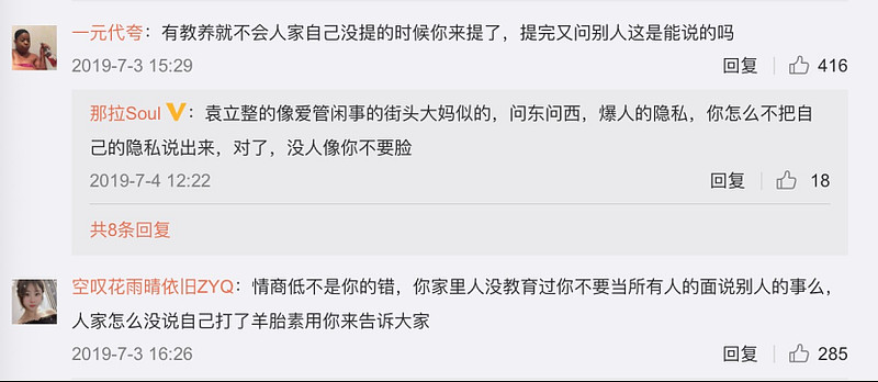 2019年,袁立再次在微博上回應羊胎素事件,其評論區風向仍然是嘲諷袁立,斯琴高娃仍舊是作為“被侮辱與被損害的”令人同情的存在。