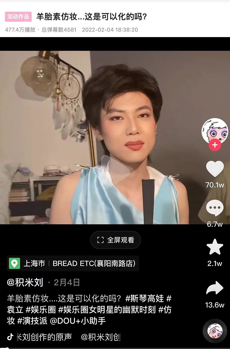 而2022年2月4日,up主積米劉在B站、抖音、微博多平台同步發佈視頻《羊胎素仿妝……這是可以化的嗎》。積米劉是一位男性博主,視頻風格以較為誇張的美妝、仿妝為主。