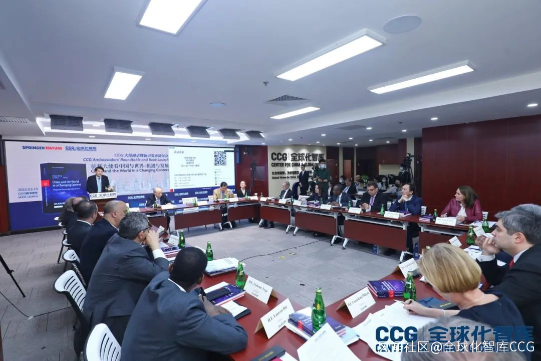 2022年3月15日,全球化智庫(CCG)在北京發佈由CCG理事長王輝耀和秘書長苗綠主編,施普林格·自然集團(Springer Nature)出版的新書《駐華大使看中國與世界》(China and the World in a Changing Context: Perspectives from Ambassadors to China),並舉辦大使圓桌會。二十七位駐華大使為本書撰稿,並有二十位駐華大使蒞臨CCG,對各國廣為關注的多邊主義、貿易投資及全球治理等國際熱點話題進行研討。施普林格·自然集團政治科學和法律編輯部主任William Achauer先生、CCG理事長王輝耀博士和秘書長苗綠博士分別從出版方和編著方角度進行了致辭。