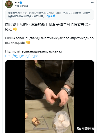2月27日,烏克蘭國民警衞隊在社交平台上發佈“亞速營”士兵用豬油塗抹子彈的視頻,並聲稱要用這些子彈對付車臣的穆斯林士兵。