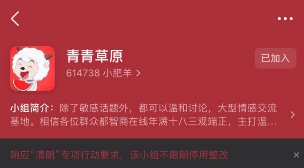“清朗”專項行動開始後,豆瓣娛樂小組幾乎全軍覆沒。鵝組、青青草原等20個娛樂類小組被暫停轉發/收藏功能,豆瓣火研組等25個小組被直接關停。此外,豆瓣還下架了小組中的娛樂分區功能,屏蔽了“吃瓜”“八卦”等關鍵詞。風頭過後,被暫時關停的小組再度開張,但粉絲們也明白樹大招風,“是時候找新家了”。