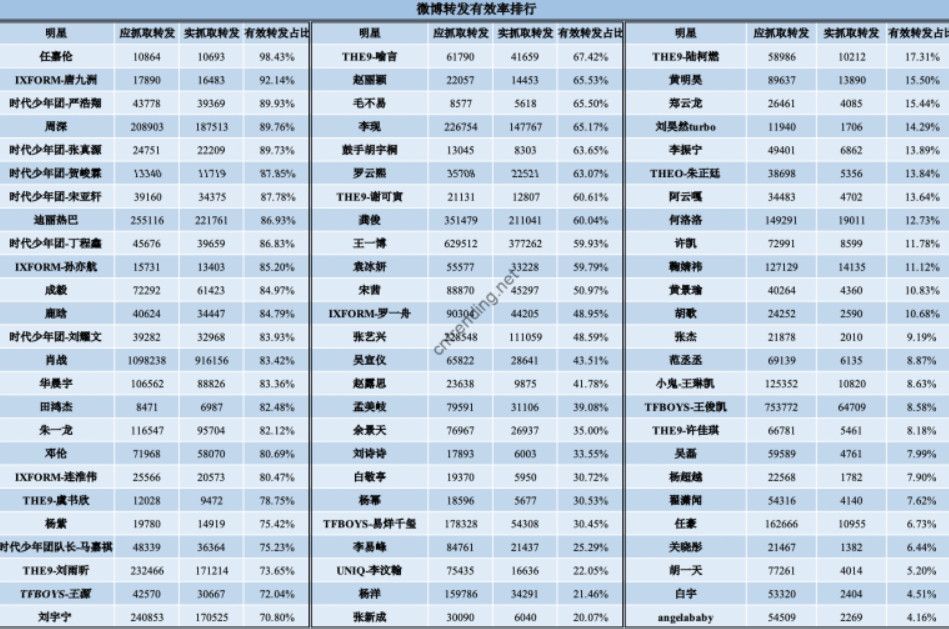**平台官方榜單被叫停,但禁止不了民間榜單的誕生。**在貼吧等平台,常有熱心人士分享“內娛CP榜單”“微博轉發有效率排行”等榜單,“應抓取轉發”“實抓取轉發”等分類看起來煞有介事。粉絲則本着寧可信其有不可信其無的原則,繼續為偶像的成績添磚加瓦。