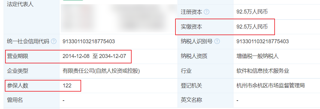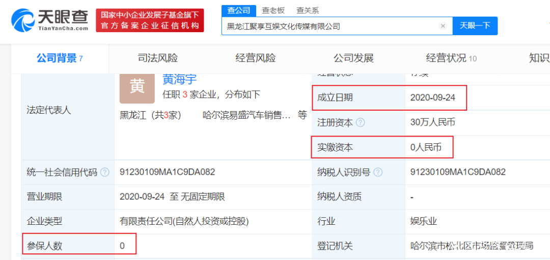 下面這個是涉事公司的工商信息,大家可以品品,成立不滿 2 年,實繳資本為 0 ,參保人數為 0 。