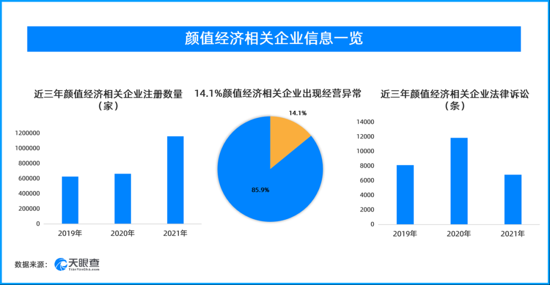 其實 14.1% 的顏值經濟相關企業都出現經營異常,2021 年顏值經濟企業迎來近 8000 條法律訴訟。。。