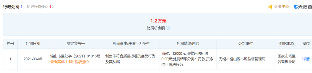 2021 年由於製造銷售不符合質量標準的商品被市場監管局罰了 1.2 萬。