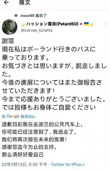 推特上還有一位日本網紅,原本摩拳擦掌要去烏克蘭試試身手。結果據網友所説:他還沒進烏克蘭,便聽説俄軍把西方志願者給炸了,瞬間破了膽,留波蘭“幫助難民”了。