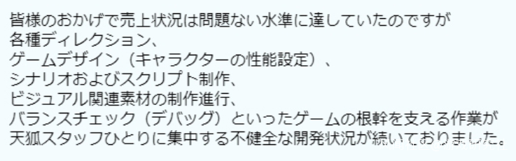 而現如今,這位員工似乎是真的撐不下去了,如果要繼續運營下去的話,勢必會導致遊戲質量下滑以及對該員工的進一步壓榨。為了員工的健康與系列作品今後的發展,官方作出的決定是向平台方主動提出停服。