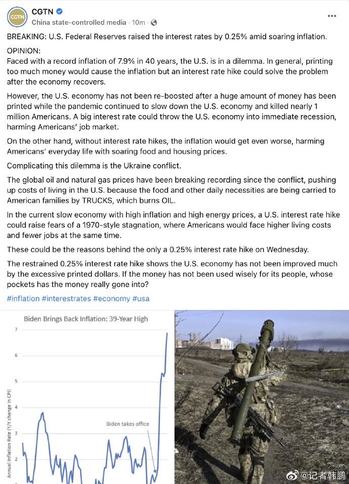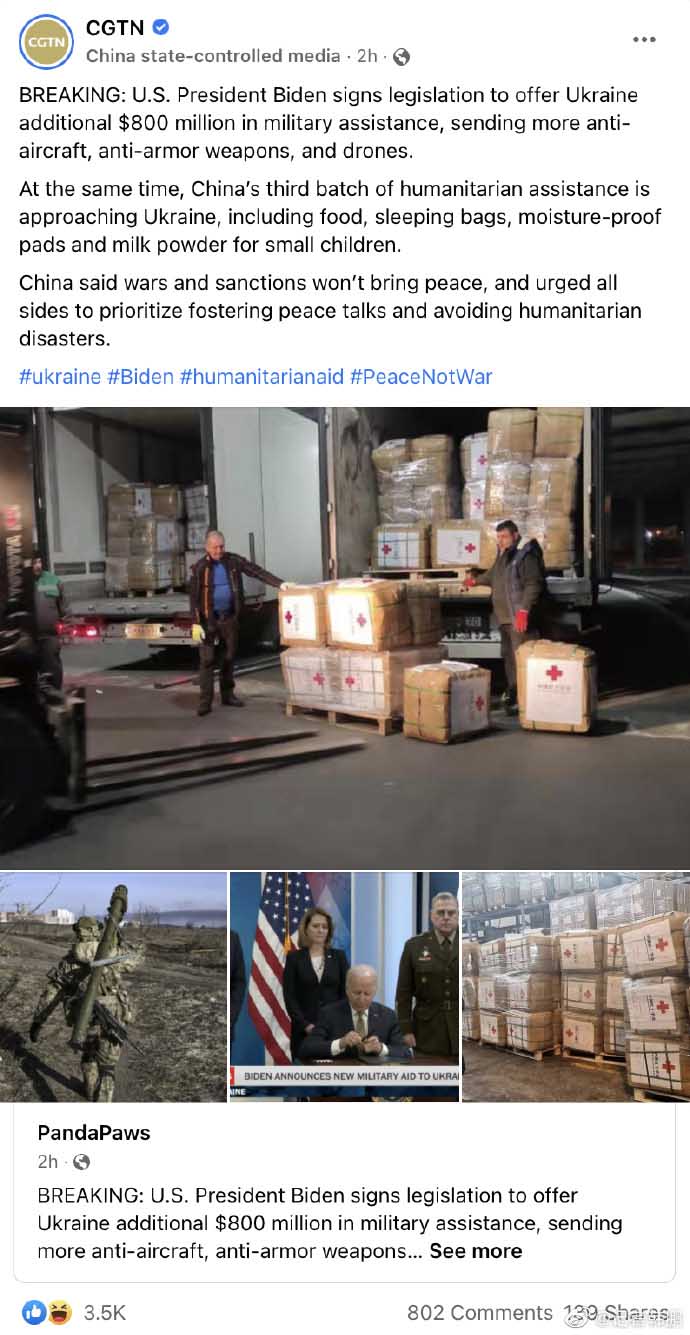放心,當然用英文對外發了。尤其是美國向烏克蘭運武器、中國向烏克蘭運人道主義物資那條,在CGTN的臉書賬號上,僅2小時就有800多條評論、3.5K點贊,見截圖,比我流量高多了!評論區裏,境外網友一致譴責美國虛偽無恥。