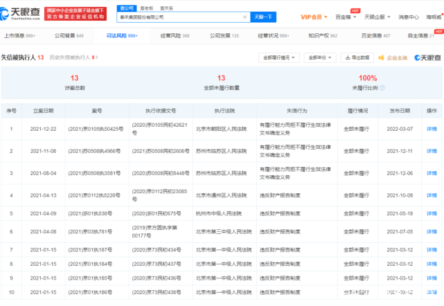 天眼查資料顯示,泰禾集團已13次成為失信被執行人。