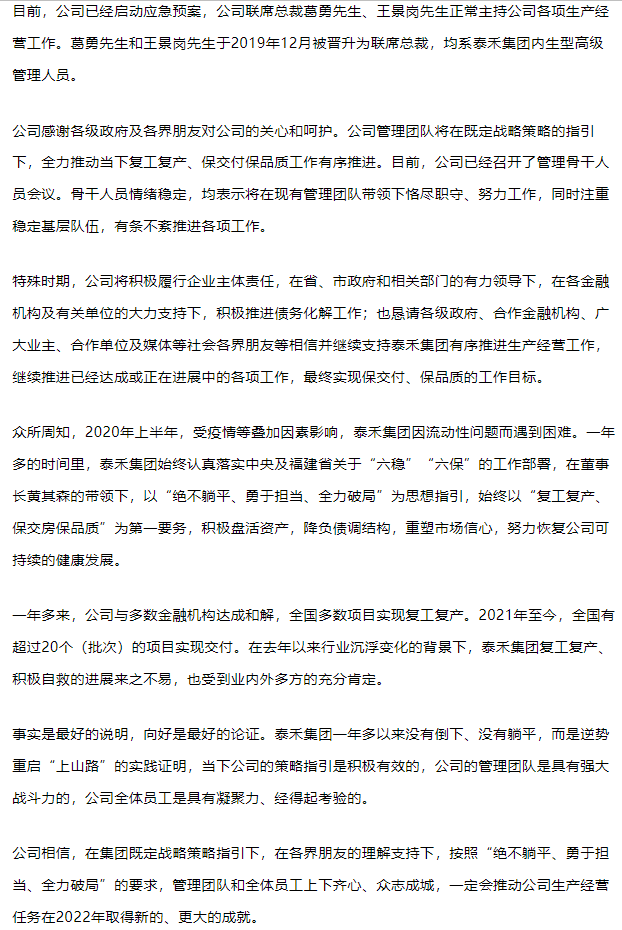 公開信中提到,2020年上半年,受疫情等疊加因素影響,泰禾集團因流動性問題而遇到困難。一年多來,公司與多數金融機構達成和解,全國多數項目實現復工復產。2021年至今,全國有超過20個(批次)的項目實現交付。