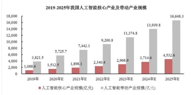 隨着AI技術的逐漸成熟,科技、製造業等業界巨頭佈局的深入,人工智能的應用場景不斷擴展。據艾瑞發佈的《中國人工智能產業研究報告(2020 年)》報告顯示,2019 年,中國人工智能核心產業及帶動產業規模分別為 1,088.6 億元和 3,821.5 億元,預計至2025 年將分別達到 4,532.6 億元和 16,648.3 億元,年均複合增長率分別為 26.8%和 27.8%。