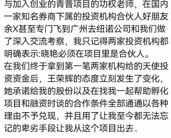 李曉豔稱,原本承諾給的股份以及在之前談的合作條件全部成為空頭支票,”並且用了讓我至今都無法忘記的卑劣手段讓我從這個項目出去”。