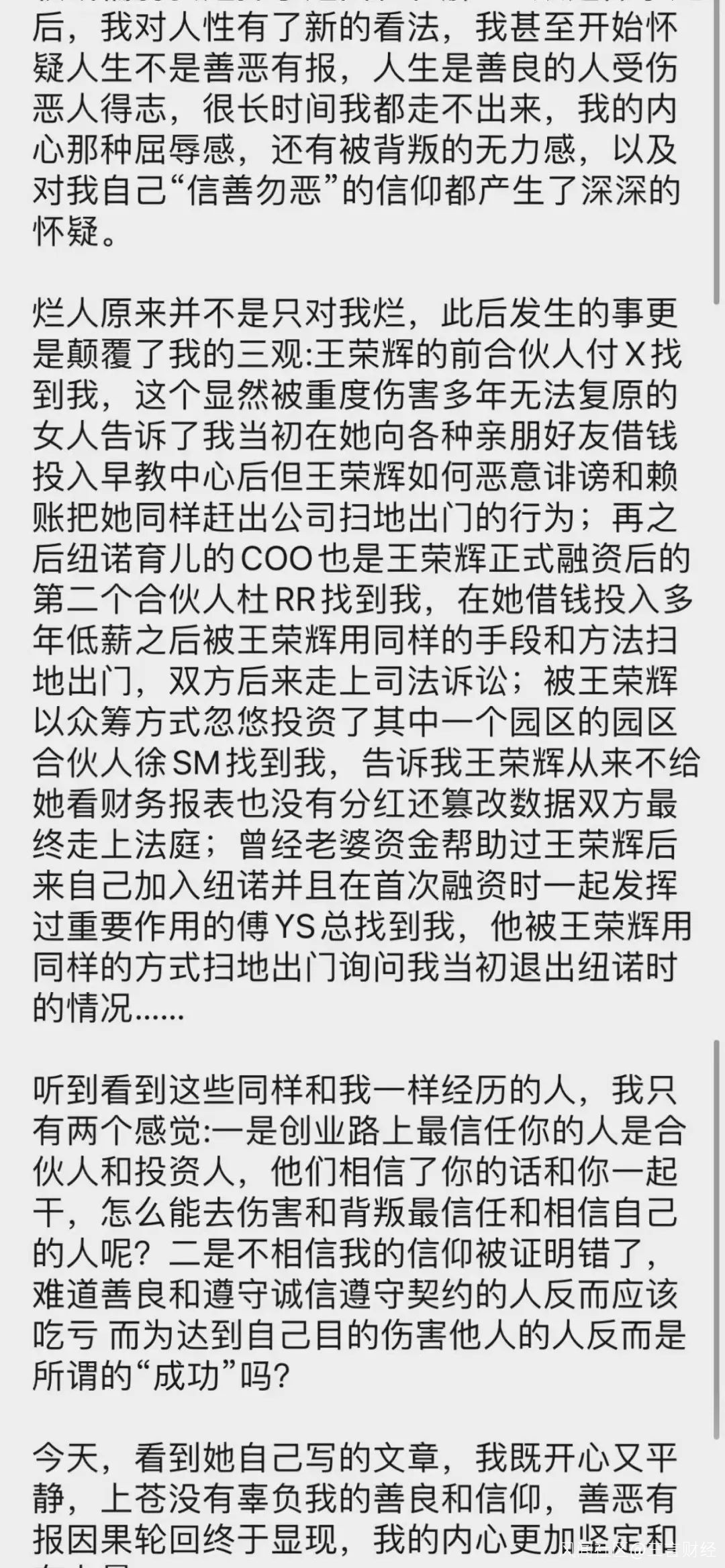 爆料中的細節算比較詳細,比如付X是借錢投入早教中心後,但被王榮輝惡意誹謗和賴賬趕出公司、掃地出門。