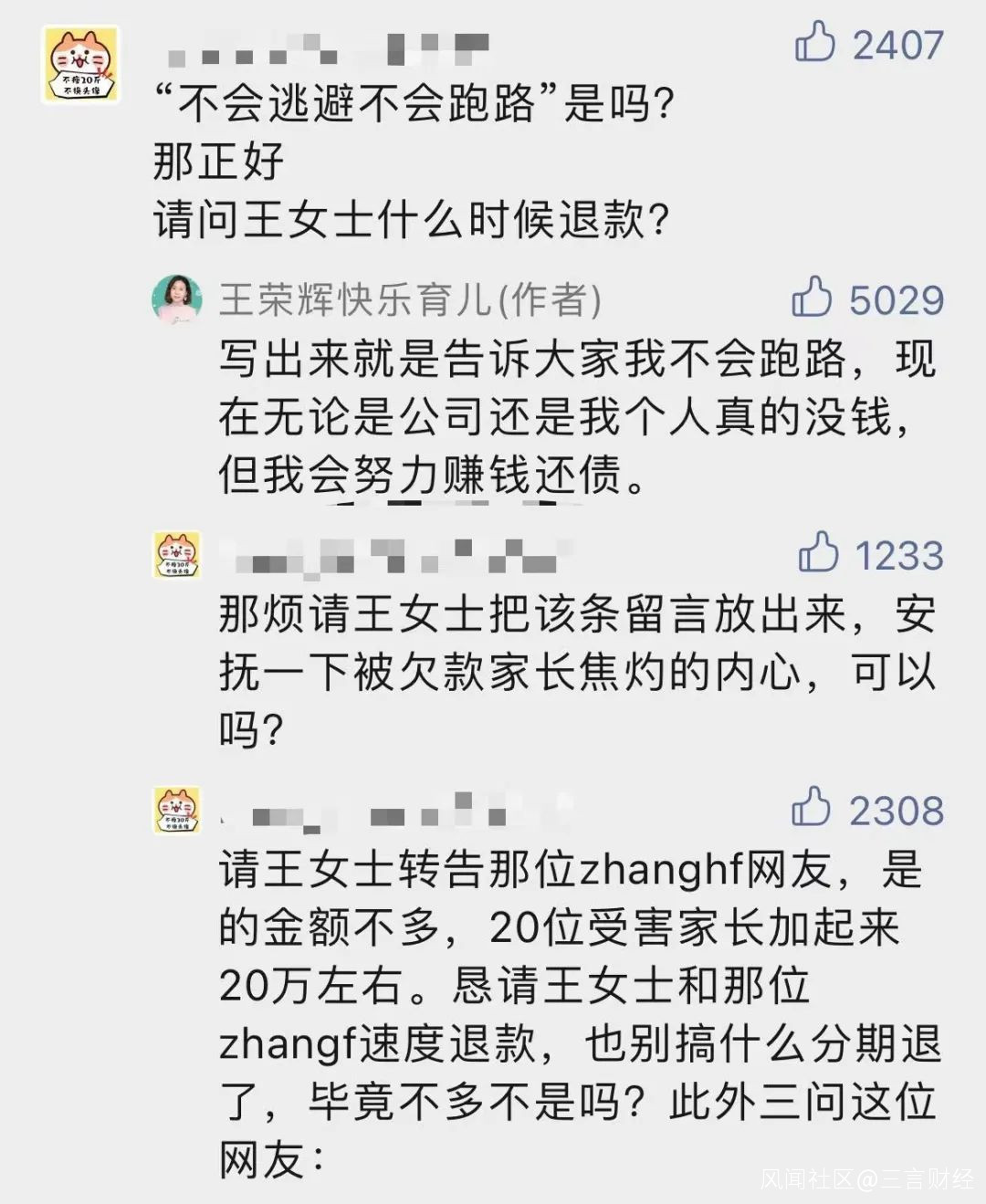 與公眾號的評論完全相反,在王榮輝的微博評論區,排名靠前的兩則留言都是家長討債的。