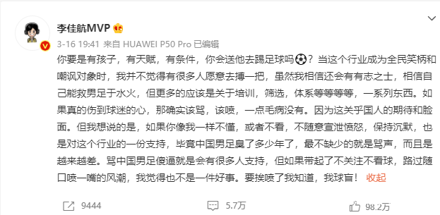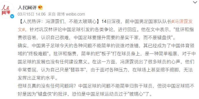 “中國足球的問題不能簡單歸咎於球員,但説中國足球搞不好是因為‘鍵盤俠’的批評,恐怕是中國足球運動員過於‘玻璃心’了。”