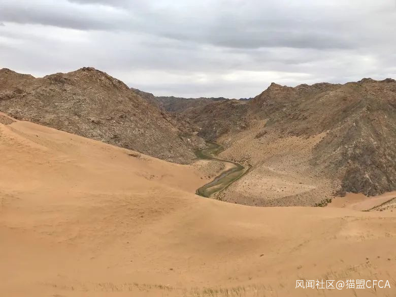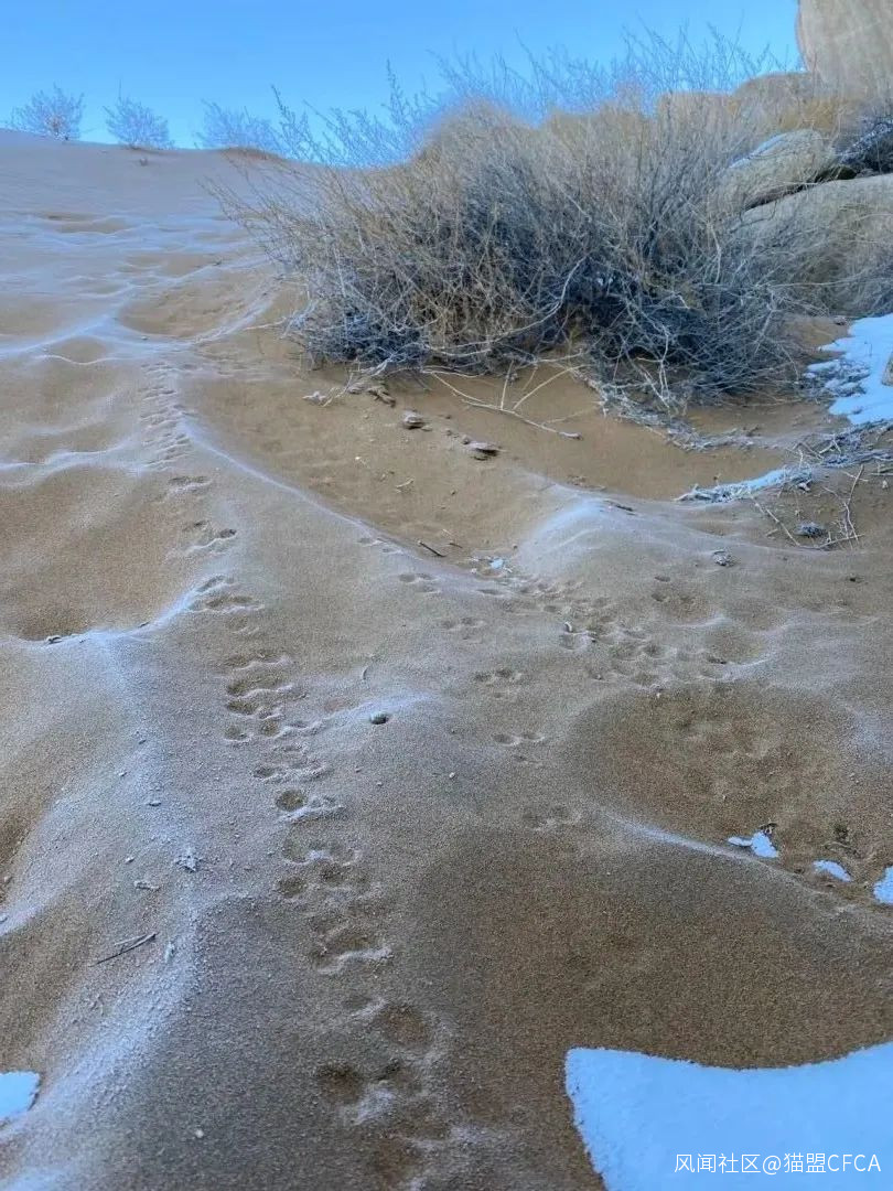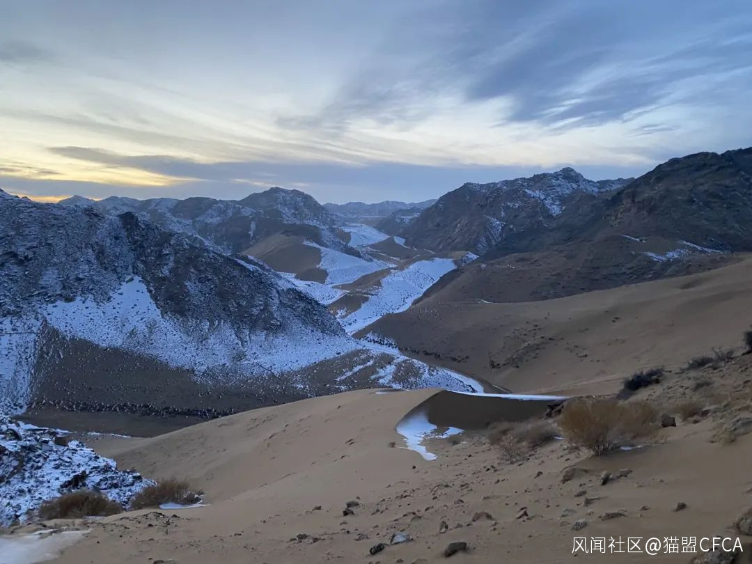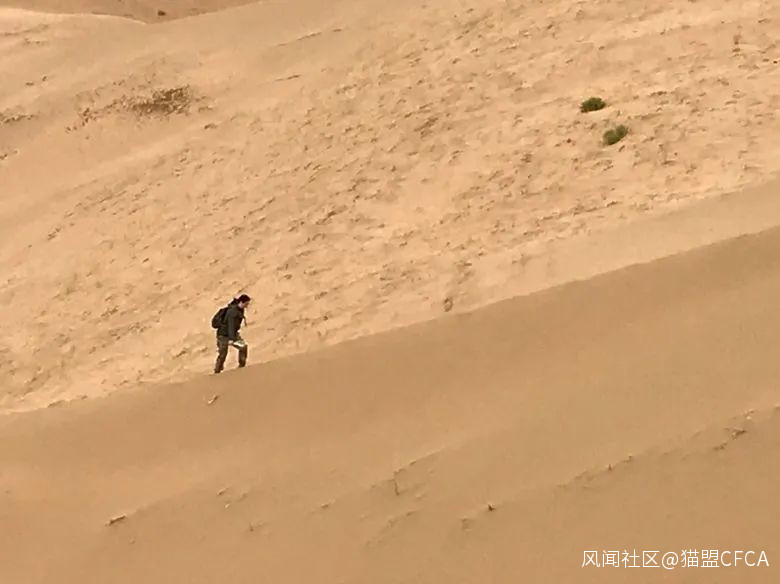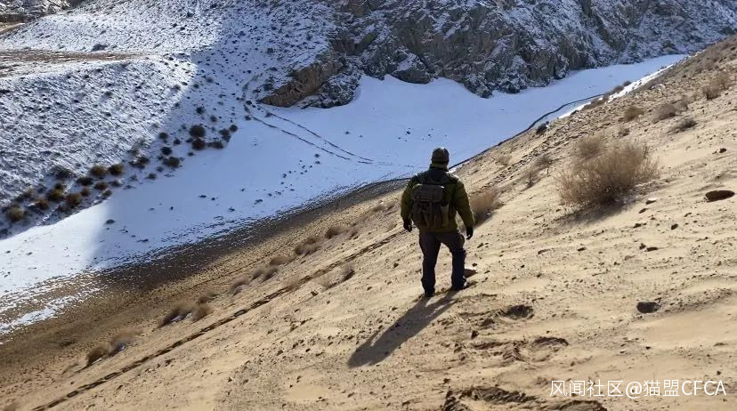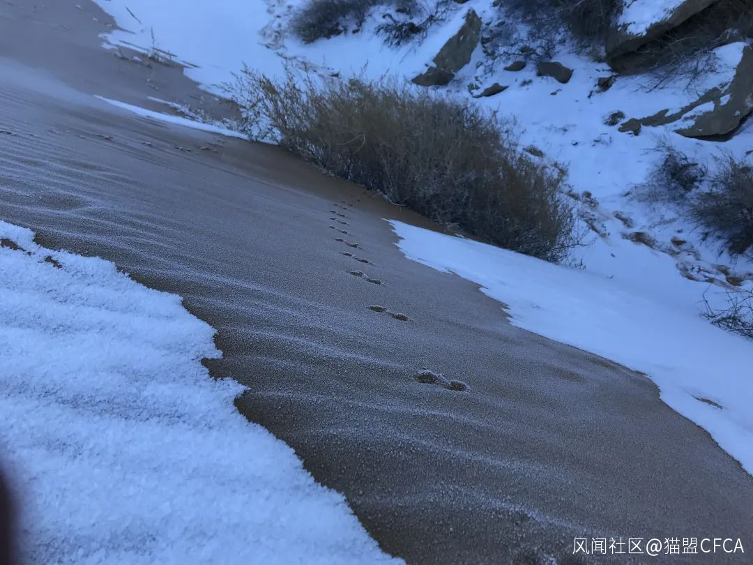不過我也得出了一點經驗:相比之下,沒雪的沙漠地面確實比有雪的凍得更嚴實、更好走,同一個沙丘而言,雪少的一面也會更結實;但千萬不能走草根或植物的旁邊,那些周圍的土很鬆軟,也非常容易被踩塌;當然要是有石頭在沙地中間的話……