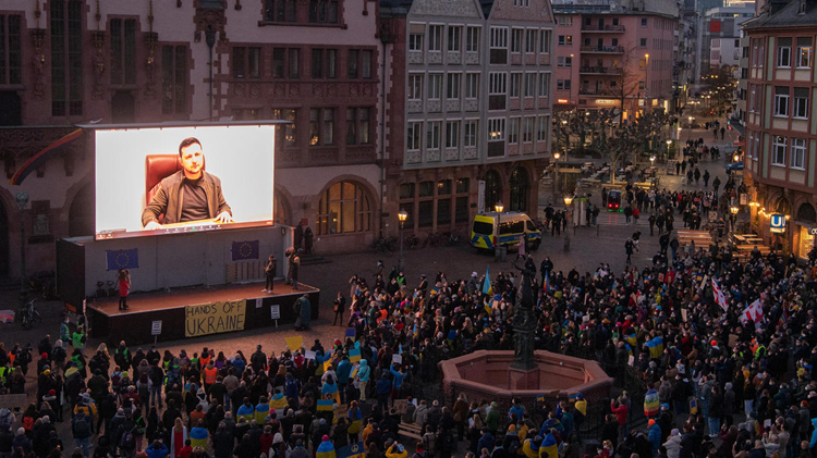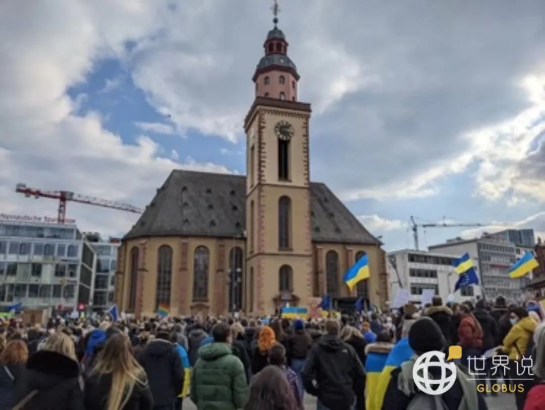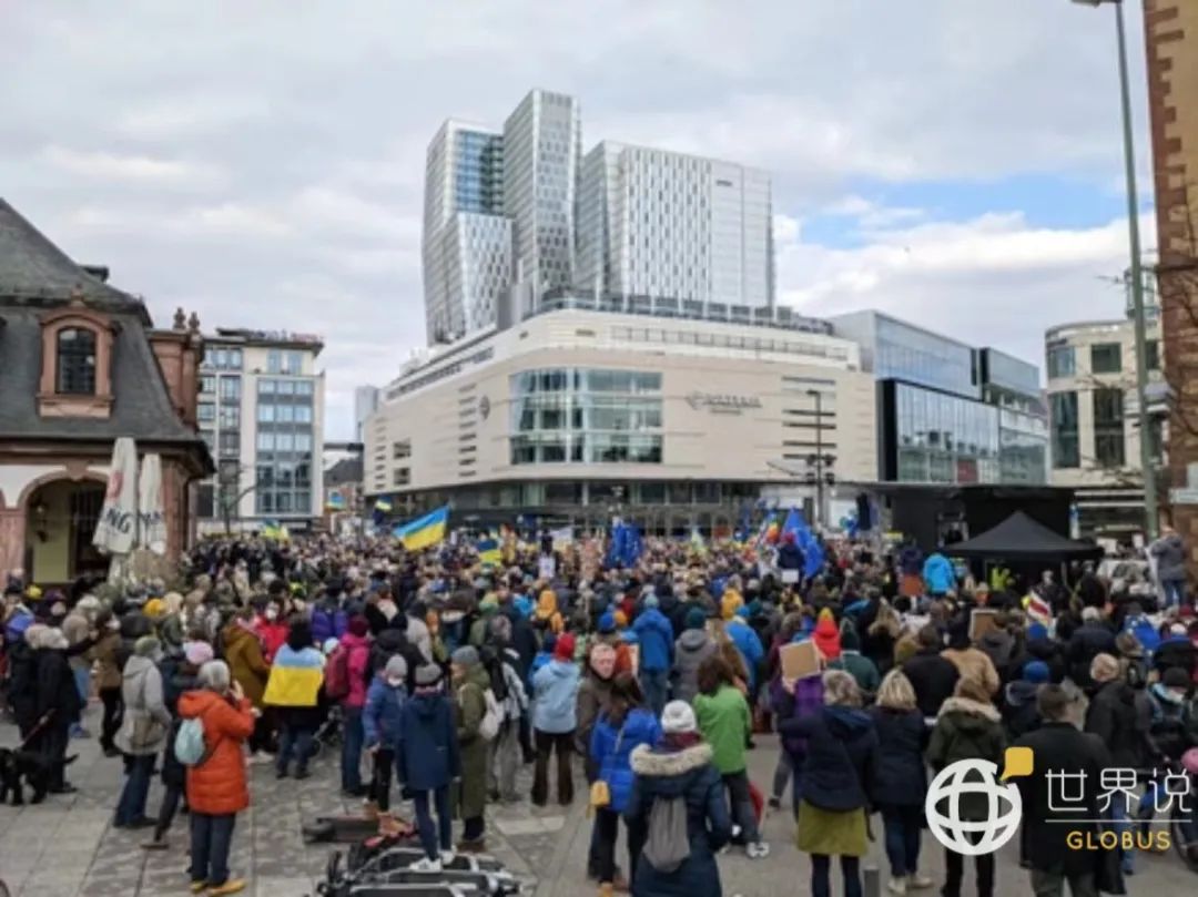 3月4日在法蘭克福羅馬人廣場上進行了澤連斯基演講的實況轉播,吸引了2000人蔘與。週日在主守衞台廣場的遊行再次吸引了2000餘人參加。而週六在維利•勃蘭特廣場組織的反對千億歐元擴軍的遊行,卻沒什麼人蔘與。