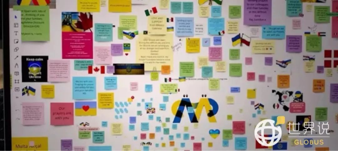 ● 筆者公司聲援烏克蘭的貼紙牆 / 世界説