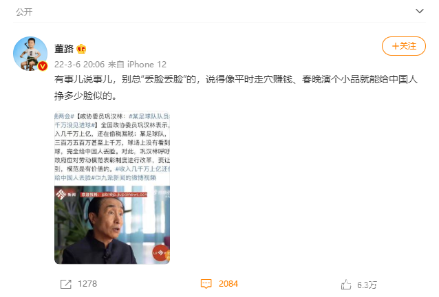 鞏漢林那段話,主要講的還不是男足,畢竟他還舉了上億貪腐、明星偷税漏税的例子,沒想到男足球員倒是先出來説話了,成功把注意力都聚集到了男足身上。