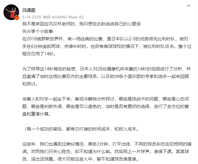 這篇微博的大致意思是,足球圈外的人不知道圈內究竟發生了什麼,卻拿着足球話題來換取流量,放大球員的失誤,讓球員壓力很大,越來越沒有信心。這樣盯着球員,放大他們的失誤,扭曲他們的意思,對球員踢好球沒有幫助,反而有害。如今中超形勢不好了,“大部分球隊都拖欠工資平均1年以上”,但“大部分球員和俱樂部都相互理解和信任,共度難關,為了熱愛,為了情懷,也為了工作”,足球運動員的表現已經很不錯了。他懇求大家不要硬層足球的流量,而是正面地探討足球,“大家的共同目標都是希望中國足球更好,那我們為什麼不可以從更好的角度,去報道和挖掘故事,用更敏鋭的正能量去探索和思考我們的足球呢?”
