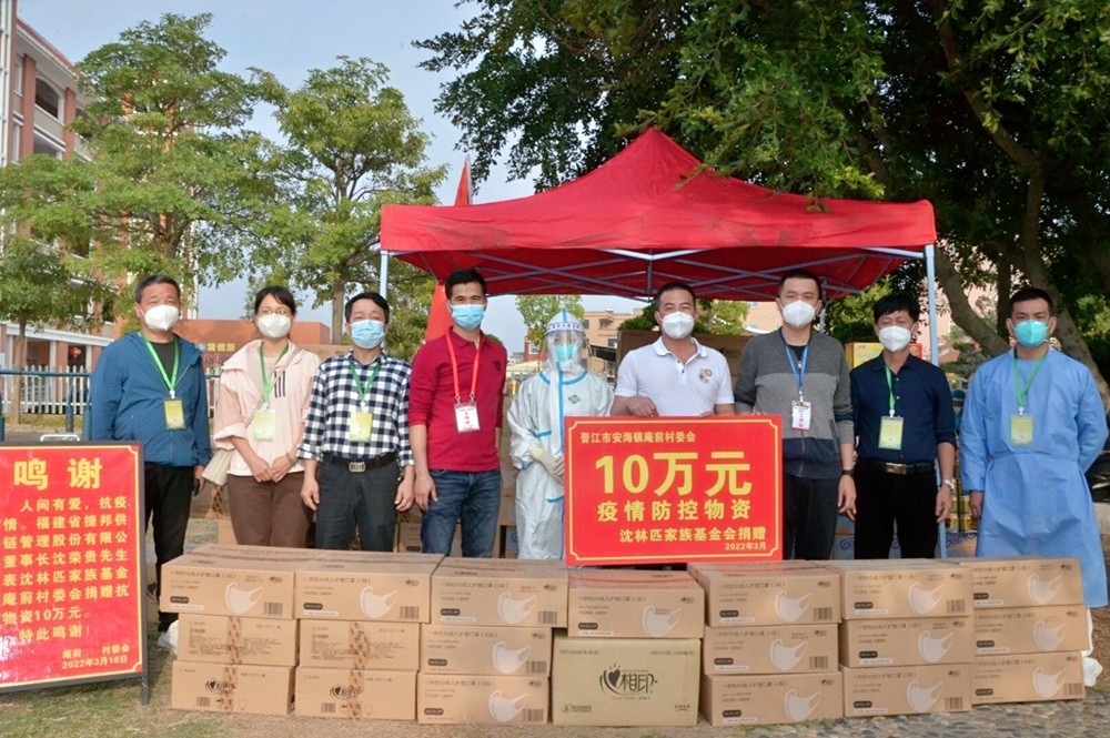 3月16日下午,沈榮貴代表沈林匹家族基金向晉江市安海鎮庵前村村委會捐贈了10萬元的防疫物資,包括40箱一次性口罩、大批量的消毒用品與快速食品、礦泉水、飲料、水果等物品。