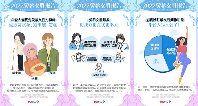 3月8日,在全國婦聯宣傳部指導下,優酷發佈《2022熒幕女性報告》。報告指出,有超過一半的觀眾表示女性在影視作品中的形象發生了變化,女性形象更加多元、立體,打破刻板印象內容也在增多。同時,也有超半數的年輕人“會將熒幕中的形象作為現實生活中的榜樣。”