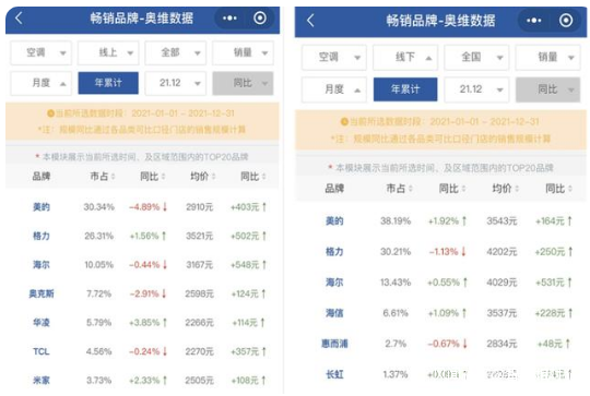 數據顯示,2021年全年(1月1日-12月31日)無論是線上還是線下市場,美的的市佔率均超過格力,排名第一。但即便如此,美的也有自己的煩惱,從去年上半年財報數據來看,雖然整體收入美的領先格力近100億元,然而收入增幅方面格力以62.57%大幅領先美的的19.33%。並且在毛利率方面格力空調為29.8%,美的只有20.85%,格力領先美的近9個百分點。