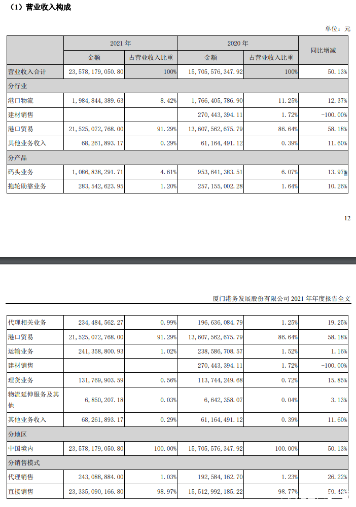 3月18日,廈門港務發佈2021年年報,報告指出,廈門港務2021年總營收為235.78億元,同比增長50.13%,歸屬於上市公司股東的淨利潤為2.39億元,同比增長78.62%,基本每股收益為0.38元/股,同比增長76.38%。