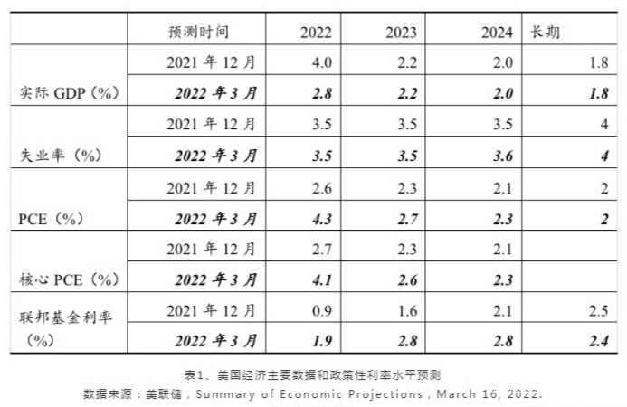 在同時公佈的經濟預測中,美聯儲對美國經濟參數進行了大幅度修正。2022年經濟增速由去年12月份的4.0%大幅度下調至2.8%,其他年份預測不變;2022年PCE由去年12月份的2.6%大幅度上調至4.3%,2023-2024年有小幅上調;2022年核心PCE由去年12月份的2.7%大幅度上調至4.1%,2023-2024年有小幅上調;2022年政策性利率水平由去年12月份的0.9%大幅度上調至1.9%,2023-2024也有較大幅度的上調;唯一幾乎不變預測的參數是失業率,基本維持在3.5%(表1)。