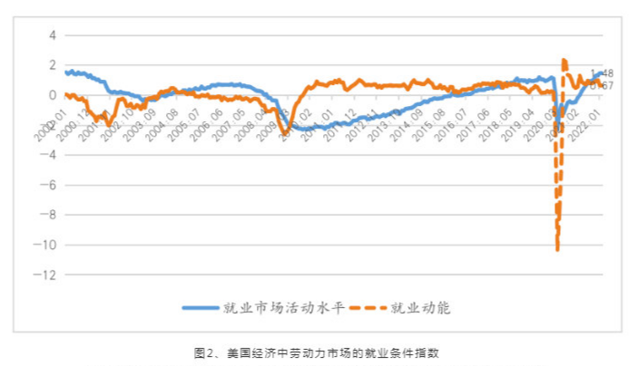 從美國勞動力就業市場的情況來看,就業市場的活動水平持續上漲,就業市場動能出現了邊際遞減,但2022年2月份仍保持在0.67的水平(圖2),這説明美國勞動力就業市場的活動水平還將持續上漲,美聯儲把2022-2023年失業率預測值定在3.5%。
